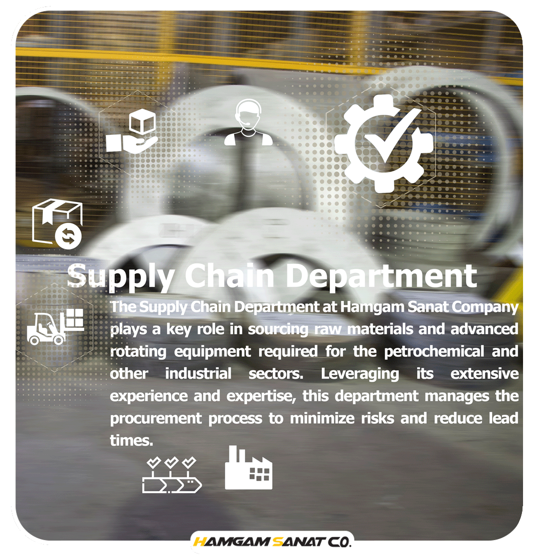 The Supply Chain Department at Hamgam Sanat Company plays a key role in sourcing raw materials and advanced rotating equipment required for the petrochemical and other industrial sectors. Leveraging its extensive experience and expertise, this department manages the procurement process to minimize risks and reduce lead times.