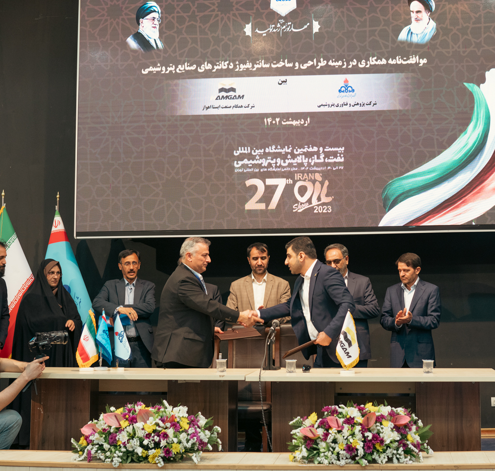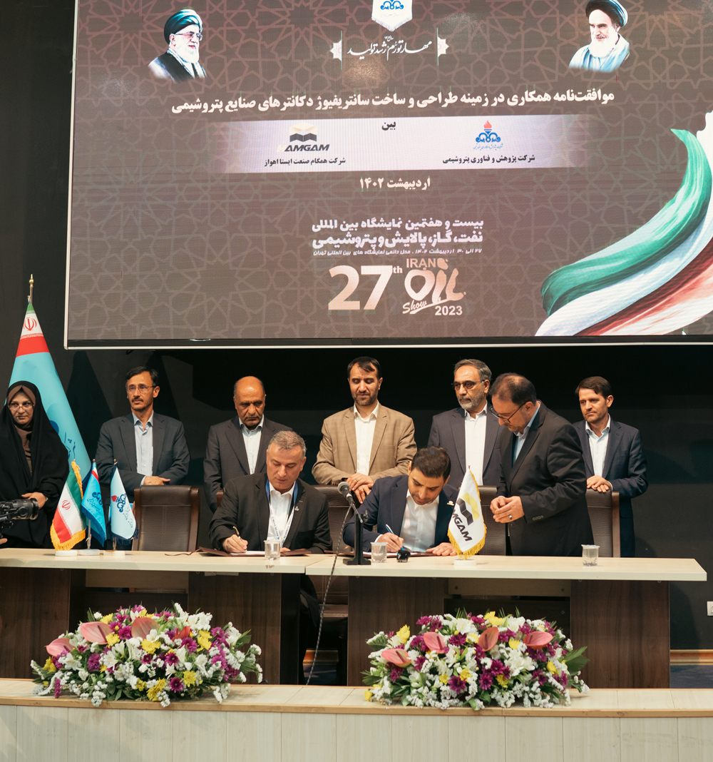در حاشیه برگزاری بیست و هفتمین نمایشگاه بین المللی نفت، گاز، پالایش و پتروشیمی آیین انعقاد موافقتنامه بین شرکت دانشبنیان همگام صنعت و شرکت ملی صنایع پتروشیمی ایران در خصوص طراحی و ساخت سانتریفیوژ دکانتر واحد های تولید H.D.P.E و PVC در طرحهای با لایسنس شرکت پژوهش و فناوری پتروشیمی برگزار شد. این قرارداد بین علی داودی مدیرعامل شرکت همگام صنعت و دکتر مجید دفتری معاون مدیرعامل شرکت ملی صنایع پتروشیمی ایران و مدیرعامل شرکت پژوهش و فناوری پتروشیمی به امضا رسید. در این مراسم که مرتضی شاهمیرزایی مدیرعامل شرکت ملی صنایع پتروشیمی ایران و تعدادی از مدیران ارشد این شرکت حضور داشتند ، مدیرعامل شرکت همگام صنعت ضمن معرفی توانمندی شرکت همگام صنعت در خصوص طراحی و ساخت سانترفیوژ دکانترهای مورد نیاز صنعت پتروشیمی به موانع موجود در بکارگیری تجهیزات تولید داخل و فقدان اهتمام لازم در میان پیمانکاران EPC طرح های در دست اجرا اشاره نمود و از مدیرعامل شرکت ملی صنایع پتروشیمی درخواست نمود تا ساز و کار بکارگیری توانمندی شرکت های دانش بنیان خصوصا" در طرح های در دست اجرا تقویت گردد و نظارت بر اجرای قوانین مربوط به این موضوع ،خصوصا" قانون حداکثر استفاده از توان تولیدی و خدماتی کشور و حمایت از کالای ایرانی ، تشدید گردد .